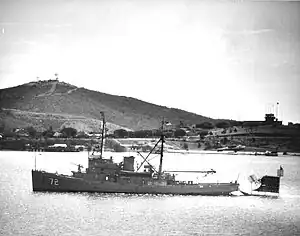 ![]() USS Kiowa (ATF-72) towing a target sled into Guantánamo Bay, Cuba, in a photograph taken from the anti-submarine warfare carrier USS Intrepid (CVS-11) on 27 February 1963. | |
