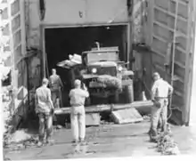 Unloading onto pontoons to cross a shallow beach.