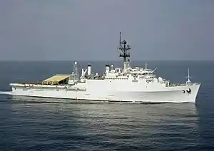La Salle was converted to a "miscellaneous command ship" and given the hull classification symbol AGF-3 after an overhaul in 1972. After re-fitting in 1972 she was sent to homeport in Bahrain and serve in a mainly surveillance capacity, with as many as 60 NSA personell assigned to the ship, at a time when one of America's main allies in the Middle East, the Shah of Iran, controlled the Persian Gulf. To accommodate all the extra electronic equipment, the La Salle was painted white to reflect the heat of its operating environment. Admiral William J. Crowe, who later became Chairman of the Joint Chiefs of Staff under President Ronald Reagan, was named Commander Middle East Force and assigned to La Salle to serve in this sensitive role. In this time before the Gulf War, piracy off the east coast of Africa and the re-activation of the U.S. Fifth Fleet, only La Salle along with two U.S. Navy destroyers dispatched from the U.S. east coast on a six-month rotating basis were routinely on patrol in the Persian Gulf, Red Sea and the general Indian Ocean regions. La Salle was considered by the Navy to be isolated duty and anything but a plum assignment by its crew. To symbolize its relatively minor status as a fighting ship at this time, La Salle's nickname, emblazoned on T-shirts sold in the ship's store and wryly smiled about by those many of the ship's crew who wore them, unofficially became "The Great White Whale". By the time of Gulf War the ship had become known, more appropriately to its future operational roles, by its new nickname "The Great White Ghost of the Arabian Coast".[1]