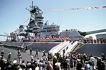 Missouri arrived at Norfolk on 4 May; Rear Admiral E. T. Woolridge, commander, Battleships-Cruisers, Atlantic Fleet, hoisted his flag aboard her 10 days later. She departed on 8 June on a midshipman training cruise to Brazil, Cuba and Panama and returned to Norfolk on 4 August. Woolridge hauled down his flag in October as he transferred to another ship; Rear Admiral Clark Green, commander of Battleship Division 2 replaced him. The battleship was overhauled in Norfolk Naval Shipyard from 20 November to 2 April 1954 that included replacing her 16-inch guns[64] and exchanging her SP radar for a SPS-8 system that required strengthening the mainmast to handle its weight.[65] The day before the end of the overhaul, Captain Taylor Keith relieved Brodie in command of the ship. As the flagship of Rear Admiral Ruthven Libby, who had relieved Woolridge, Missouri departed Norfolk on 7 June as the flagship of the midshipman training cruise to Lisbon, Portugal, Cherbourg, France, and Cuba.[66] During this voyage Missouri was joined by the other three battleships of her class, the only time the four ships sailed together.[67] She returned to Norfolk on 3 August and departed on 23 August to be placed in reserve on the West Coast. The ship hosted 16,900 people at Long Beach, but more than 20,100 visited in San Francisco.[68] Missouri arrived in Seattle on 15 September where she again hosted visitors and subsequently off-loaded her ammunition at the facility in Bangor.[69] The ship was decommissioned on 26 February 1955 at Puget Sound Naval Shipyard where she was assigned to the Bremerton group of the Pacific Reserve Fleet.[16][70][71] Missouri retained her Mark 27 radar until the mid-1950s.[72]