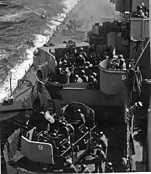 On 14 December, Missouri departed San Francisco and sailed for Ulithi in the Caroline Islands, where she joined the rest of the fleet on 13 January 1945. She became a temporary headquarters ship for Vice Admiral Marc A. Mitscher.[16] She then joined Task Force 58, which sortied on 27 January to launch an air attack on Tokyo in support of the planned operation against Iwo Jima. Missouri served as part of the anti-aircraft screen for Task Group 58.2, centered on the carriers Lexington, Hancock, and San Jacinto, during the raid on Tokyo.[21] In addition to guarding the carriers, Missouri and the other battleships acted as oilers for the escorting destroyers, since the fleet's logistics train could not accompany the strike force during raids.[22]