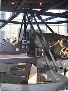 The ship was powered by a single-cylinder horizontal vibrating-lever steam engine,[29] also designed by Ericsson, which drove a 9-foot (2.7 m) propeller,[27] whose shaft was nine inches in diameter.[30] The engine used steam generated by two horizontal fire-tube boilers[31] at a maximum pressure of 40 psi (276 kPa; 3 kgf/cm2).[32] The 320-indicated-horsepower (240 kW) engine was designed to give the ship a top speed of 8 knots (15 km/h; 9.2 mph), but Monitor was 1–2 knots (1.9–3.7 km/h; 1.2–2.3 mph) slower in service.[29] The engine had a bore of 36 inches (914 mm) and a stroke of 22 inches (559 mm).[28] The ship carried 100 long tons (100 t) of coal.[29] Ventilation for the vessel was supplied by two centrifugal blowers near the stern, each of which was powered by a 6-horsepower (4.5 kW) steam engine. One fan circulated air throughout the ship, but the other one forced air through the boilers, which depended on this forced draught. Leather belts connected the blowers to their engines and they would stretch when wet, often disabling the fans and boilers. The ship's pumps were steam operated and water would accumulate in the ship if the pumps could not get enough steam to work.[27]