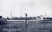 The ship was renamed USAHS Charles A. Stafford after Captain Charles A. Stafford of the U.S. Army Medical Corps, who was killed during the air raid on Broome, Western Australia, while participating in the evacuation of Java on 3 March 1942. With her conversion complete in September 1944, the Stafford, equipped with new boilers, a single stack in place of her original two, and other improvements, moved to her new homeport of Charleston.[4][28] From that port the ship made monthly runs to the United Kingdom and back until May 1945, interrupting the pattern only once for a trip to Gibraltar and Marseilles. Steaming to New York at the conclusion of her last transatlantic run, Charles A. Stafford was overhauled for duty in the South Pacific.[4]