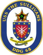 The dark blue and gold, on the shield of the coat of arms, represent the sea and excellence. They are also the US Navy's traditional colors. Red is emblematic of courage and sacrifice. The five interlaced swords honor the five Sullivan brothers killed in action during World War II and commemorate their spirit of teamwork and patriotism. The upright points of the swords allude to the present ship's combat readiness and her missile system. The border reflects unity and the eleven stars represent the battle stars earned by the first The Sullivans (DD-537); nine for World War II and two for the Korean War. The trident on the crest, a symbol of sea prowess, symbolizes DDG-68's modern warfare capabilities; the AEGIS and vertical launch system. The fireball underscores the Guadalcanal campaign where the five brothers were killed in action while serving on USS Juneau, and highlights the firepower of both past and present USS The Sullivans. The inverted wreath, a traditional symbol of the ultimate sacrifice, is also in memory of the Sullivan brothers. The shamrock recalls the Irish heritage. The arms, on the seal, are blazoned in full color upon a white oval enclosed by a dark blue collar edged on the outside with a gold rope and bearing the name "USS THE SULLIVANS" at the top and "DDG 68" in the base in gold.[22]