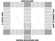 The structure is a rectangular building having a dimension of 86 meters long and 74 meters wide with two interior courtyards or patios. The most significant feature is the fact that it is actually made up of 40 separate structures independent from one another with the only opportunity provided by pre-cast stab flooring.[4] But some locations of the separations are now difficult to determine exactly because of the numerous cosmetic changes the interior of the building which has undergone over the years. According to an article written by the former dean of Faculty of Engineering, Manuel Mañosa, this is how it is divided: