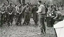 On 16 September 1940, the 45th Infantry Division, under Major General William S. Key, was federalized from state control.[7] It was one of four National Guard divisions to be federalized on that day, alongside the 30th, the 41st and 44th Infantry Divisions, originally for a one-year period.[15] Its men immediately began basic combat training at Fort Sill, Oklahoma.[16] In August 1941, the 45th Infantry Division took part in the Louisiana Maneuvers, the largest peacetime exercises in U.S. military history.[17] The division was assigned to VIII Corps with the 2nd Infantry Division and the 36th Infantry Division, camped near Pitkin, Louisiana.[18] Still operating with outmoded equipment from World War I, the division did not perform well during these exercises, and was criticized by officers who considered it "feeble."[19][18] In spite of these deficiencies, less than one month later, the men's tour of duty was extended for another eighteen months, much to their chagrin, because of concerns of an impending American entry into World War II.[17]