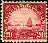 • Statue of Liberty Issued on November 11, 1922, this is the first U.S. Postage stamp to feature the Statue of Liberty. The design for this issue is unlike any other in the series with its arrangement of lettering and ornaments. Clair Aubrey Huston designed the stamp taking his inspiration from an 1888 engraving by Charles Skinner, formally of the American Bank Note Company. Louis S. Schofield engraved the die for the image of Liberty. Edward Hall and Joachim Benzing engraved the frame, which is unique in the series.[1][18]