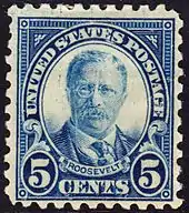 • Theodore Roosevelt This is the first postage stamp to honor Roosevelt. It was issued on his birthday, October 27, 1922, in Washington D.C. and in his home town of Oyster Bay, New York. The stamp was commonly used on letters to foreign destinations with its blue color conforming to Universal Postal Union regulations for stamps used on foreign mail. Clair Aubrey Huston designed the stamp. The image of Roosevelt was engraved by John Eissler who modeled his engraving after a photograph taken of Roosevelt in 1907 by the Harris & Ewing firm in Washington, D.C.[5][7]