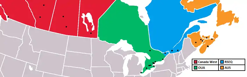 For the 2019–20 season, the Canadian university women's ice hockey competition consisted of four conferences and 34 teams. The Lethbridge Pronghorns dropped their program following the 2019-20 season.[17] The Bishop's Gaiters program joined the RSEQ conference in 2020–21 while the Trinity Western Spartans and MacEwan Griffins programs became members of the Canada West conference that same year.[18][19] However, following the cancellation of the 2020–21 season, the Laurentian Voyageurs discontinued their women's ice hockey program in 2021 leaving U Sports with 35 women's ice hockey teams.[20]