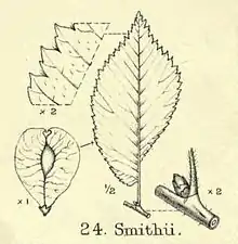 'Smithii' made a small to medium-sized tree,[4] with ascending branches bearing long pendulous shoots, downy when young and developing corky ridges.[5] The oval leaves are dark green, glabrous and glossy above, < 8.5 cm long by 4.0 cm wide, downy beneath, and long acuminate at the apex. Bean described them as "coarsely double-toothed", with 14–16 pairs of lateral veins, and a petiole about 0.75 inches (19 mm) long.[6][5][4]