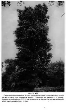 ![]() 'Columnaris' 60 ft (18 m) tall and a spread of 18 ft (5.5 m) (circa 1951). | |