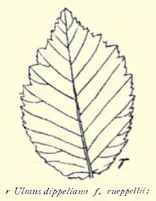 Ulmus minor 'Rueppellii' is a Field Elm cultivar said to have been introduced to Europe from Tashkent by the Späth nursery, Berlin.[2][3] Noted in 1881 as a 'new elm',[4] it was listed in Späth Catalogue 73, p. 124, 1888–89, and in subsequent catalogues, as Ulmus campestris Rueppelli, and later by Krüssmann[5] as a cultivar.[6]