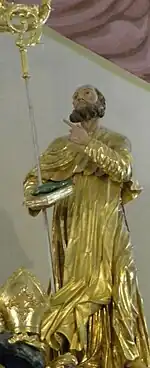 | Attributes | Bishop holding a fish; at dinner with Saint Wolfgang; rewarding a messenger with a goose leg, which turns into a fish on Friday morning; giving a garment to a beggar; with Saint Afra; riding through a river on horseback as his companion sinks; with a cross given him by an angel[2] |