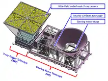 The Ultra-Fast Flash Observatory (UFFO) Pathfinder is a space observatory measuring prompt emission of gamma-ray bursts (GRB) both in optical/UV and in X-ray range down to sub-second timescales for the first time.[1] Instead of turning the whole satellite towards GRB location like the Swift Gamma-Ray Burst Mission (that takes about 100 seconds), UFFO employs a slewing mirror telescope approach – the optical path of the telescope is changed by rotation of motorized mirror within ~1 second after burst was detected.