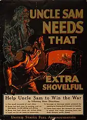 Poster by the United States Fuel Administration during World War One: "Uncle Sam needs that extra shovelful"