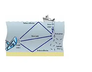 Underwater acoustic communication is a technique of sending and receiving messages in water.[1] There are several ways of employing such communication but the most common is by using hydrophones. Underwater communication is difficult due to factors such as multi-path propagation, time variations of the channel, small available bandwidth and strong signal attenuation, especially over long ranges. Compared to terrestrial communication, underwater communication has low data rates because it uses acoustic waves instead of electromagnetic waves.