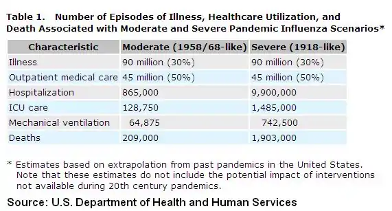 Pandemic influenza remains a serious threat. The U.S. Health and Human Services Department forecasts that if a lethal flu pandemic strikes, deaths could range from 209,000 to 1.9 million.[4]
