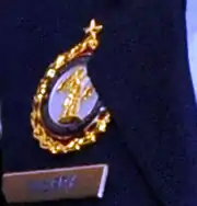 The U.S. Navy Recruiting Command Badge is worn by all Navy personnel while assigned to duty with the Navy Recruiting Command. Excellent performance, meeting criteria set by Commanding Officer Navy Recruiting Command, is acknowledged with the addition of a gold metallic wreath, called the "Gold Wreath Award," that surrounds the badge. Subsequent awards of excellence are denoted with 5/16 inch silver stars at the bottom of the wreath. Once a recruiter has achieved their 5th award, the silver stars are replaced with a gold star. Once a recruiter has achieved their 10th award, the wreath is upgraded with a gold scroll that's incorporated into the top of the wreath with the word "Excellence" embossed on the scroll. Subsequent achievements in excellence are denoted with the appropriate silver and/or gold star(s) at the bottom of the wreath. This progression continues using a large gold star on top of the scroll to signify the 20th award, a large gold star with wreath for the 25th, and two large gold stars and wreaths for the 30th. Silver and gold stars at the bottom of the wreath are used to signify awards 31 through 39 and four large gold stars, two with wreaths on top of the badge, are used to denote the 40th award. A Navy recruiter can earn up to 49 consecutive gold wreath awards for achievements in recruiting.[21][22]