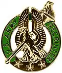 U.S. Army recruiter badges are presented to active and reserve Army personnel who are assigned to the U.S. Army Recruiting Command (USAREC). The Basic Recruiter Identification Badge is a silver crest that incorporates an eagle with raised wings straddling a flaming torch surrounded by a green banner with the words "U.S. Army Recruiter." Army Recruiters can compete for the Gold Recruiter Badge which is a gold variant of the Basic Recruiter Identification Badge and work towards qualifying for the Master Recruiter Badge.[1][2][3]