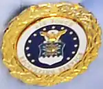 The U.S. Air Force Reserve Command Recruiting Service Badge is authorized to all personnel who are assigned to Air Force Reserve Command recruiting stations. The badge is worn as a decoration centered on the left uniform pocket for males and centered on the right side of the uniform above the nameplate for females. The badge may be modified with a gold rope that incorporates a gold banner at the bottom of the badge that denotes the recruiter's position (Staff, Assistant Senior, Senior, or Medical), referred to as the Staff Badge. Additionally, the badge may be modified with a gold wreath which incorporates a gold banner atop the badge denoting a recruiter's personal achievement (100, 200, or Master); these badges are called "Century Club Badges." Staff, Assistant Senior, Senior, or Medical recruiters with century awards have recruiter badges that are modified with a gold wreath that incorporates gold banners at the top and bottom of the badge denoting both achievement and position; these badges are called "Dual Century Club Badges." Recent official Air Force photographs of Air Force Reserve Command Recruiters wearing the Staff and Dual Century Club Badges have a numerical designation in the bottom banner where the recruiter's position is usually noted. This numerical designation could be a change in how positions are identified on the recruiter badge; however, no documentation describing this change has been found.[15][16][17]