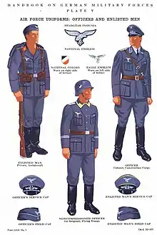The basic uniform consisted of a blue-grey single-breasted, open-collared jacket with four pockets and flaps, light blue shirt and dark blue necktie, blue-grey trousers, black leather boots and a blue-grey peaked cap, side cap or Model 1935 Stahlhelm. Ranks were indicated by seagull pips on collar patches, NCO braid along the collar's edge and on Army-style shoulder boards.