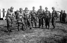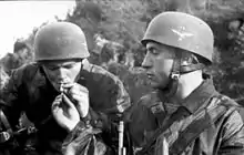 The Luftwaffe introduced the Fallschirmjäger (Airborne and Glider borne troops) helmet in 1936. With its lighter weight and lack of helmet crimping, the Fallschirmjäger helmet was similar to the Model 1935 Stahlhelm but without a helmet edge. There was also more filling in the internal of the helmet to protect the head during airborne operations. The visor and ear guards were removed to enable the headgear to be more compact and thus avoiding much of the protrusive parts in air maneuvering. The necessity of a different strap assembly was provided to prevent the loss of the helmet in the air and also giving more safety to the chin and neck regions from jolts and pressures.[3] The second Fallschirmjäger Division that saw service in North Africa, used the standard paratrooper helmet with Luftwaffe decal insignia. All were painted an Africa Korps tan, by the parachute riggers and personal equipment men of each Regt. They brushed on two or three coats of standard paint that was used on trucks. In doing this they covered up the flying eagle insignia. The paint jobs ran from excellent to poor, depending on how rushed they were and the craft ability of the artist.[3]