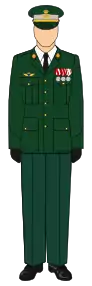 The final design was decided in 1968 and resemblances to the American Green Service Uniform.[67] It meant that the peaked cap was removed from service, except for the General Corps, who retained the M/52 cap, however with a colour change to fit with the M/69 uniform.[69][70] The M/69 is designed with 5 gold buttons (silver for HESK), two breast pockets and two lower pockets. It is worn with either a beret or a stiff forage cap for some officers.[71] The pants worn with it are a darker shade of green with a black stripe down the outseam.[70] The uniforms also features a black tie, black socks and shoes, and a white shirt. The tie was changed in 2000, from a woolen tie, to a standard tie.[42] All M/69 feature insignia denoting the branch of service on their lapel.[70] proficiency badges and tabs can be donned on the M/69 uniforms.[72]
