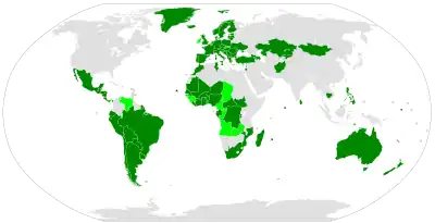 The text of the convention was adopted by the United Nations General Assembly on 10 December 1984[1] and, following ratification by the 20th state party,[3] it came into force on 26 June 1987.[1] 26 June is now recognized as the International Day in Support of Victims of Torture, in honor of the convention. Since the convention's entry was enforced, the absolute prohibition against torture and other acts of cruel, inhuman, or degrading treatment or punishment has become accepted as a principle of customary international law.[6] As of April 2022, the convention has 173 state parties.[1]