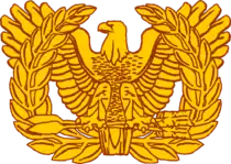 Buff | A gold color eagle with wings spread perched on a wheel with a blue felloe set with 13 gold stars, having 13 gold spokes and the hub white with a red center; superimposed on the wheel a gold sword and key crossed diagonally hilt and bow up. The insignia is 19 millimeters (3⁄4 in) in height. The enlisted version is entirely gold color metal. | |