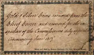 In 1801, the usual meeting was delayed, causing Mint Director Elias Boudinot to complain to President John Adams that depositors were anxious for an audit so the Mint could release coins struck from their bullion. Numismatist Fred Reed suggested that the delay was probably due to poor weather, making it difficult for officials to travel from the new capital of Washington, D.C., to Philadelphia for the assay.[4][5] In response, on March 3, 1801, Congress changed the designation of officials required to attend to "the district judge of Pennsylvania, the attorney for the United States in the district of Pennsylvania, and the commissioner of loans for the State of Pennsylvania".[6] The meeting finally took place on April 27, 1801. The 1806 and 1815 sessions were delayed because of outbreaks of disease in Philadelphia; the one in 1812 was held a month late because of a heavy snowstorm which prevented the commissioners from reaching the Mint.[7] No meeting took place in 1817; a fire had damaged the Philadelphia Mint in January 1816, and no gold or silver awaited the commission.[8] In 1818, Congress substituted the Collector of the Port of Philadelphia for the Pennsylvania loans commissioner as a member of the Assay Commission.[9] With the Coinage Act of 1834, Congress removed the automatic disqualification of Mint officers in the event of an unfavorable assay, leaving the decision to the president.[10]