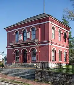 The former customshouse is set on the south side of Main Street just east of Barnstable's municipal complex. It is a two-story brick building with late Italianate styling, designed by Ammi Young and built in 1855. It has trim details of cast metal and a truncated hip roof. The building is nearly square, three bays on a side, with the front-facing bays projecting slightly. Its door and window openings have round-arch tops highlighted by light-colored trim. A line of corbeled brickwork separates the two floors, and there is more elaborate corbelling at the cornice. A carriage house with similar styling stands to the rear.[2]