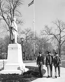 The academy grounds are home to numerous monuments and statues. The central cadet parade ground, the Plain, hosts the largest number, and includes the Washington Monument, Thayer Monument, Eisenhower Monument, MacArthur Monument, Kosciuszko Monument, and Sedgwick Monument. Patton Monument was first dedicated in front of the cadet library in 1950,[109] but in 2004 it was placed in storage to make room for the construction of Jefferson Hall. With the completion of Jefferson Hall, Patton's statue was relocated and unveiled at a temporary location on 15 May 2009, where it will remain until the completion of the renovation of the old cadet library and Bartlett Hall.[110] There is also a statue commemorating brotherhood and friendship from the École Polytechnique in the cadet central area just outside Nininger Hall. The remaining campus area is home to 27 other monuments and memorials.[111]