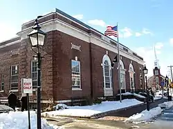 The US Post Office—Newburyport Main is a historic post office in Newburyport, Massachusetts. Construction of the Georgian Revival single story brick building was begun in 1927 and completed in 1928. It was Newburyport's first purpose-built post office facility. The building is faced in red brick laid in running bond. Its central section, which houses the lobby area, projects slightly from wings on either side, and features three round arches trimmed in marble. The wings house offices, and the rear of the building houses the service area. The front block has a pitched hip roof, while the rear portion has a flat roof.[2]