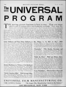 Universal Weekly and Moving Picture Weekly[15] were the alternating names of Universal's internal magazine that began publication in this era; the magazine was intended to market Universal's films to exhibitors.[16] Since much of Universal's early film output was destroyed in subsequent fires and nitrate degradation, the surviving issues of these magazines are a crucial source for film historians.[16]