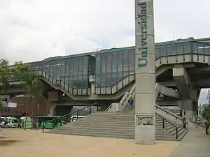 Universidad is the seventh station on line A of the Medellín Metro.[1] It is located in the eastern part of Medellín. The station is located in an area of great academic, cultural and scientific importance and a site of great confluence of routes to different parts of the city because its proximity to the University of Antioquia and metropolitan areas such the Botanical Garden of Medellín and Barefoot Park.[2] The station was opened on 30 November 1995 as part of the inaugural section of line A, from Niquía to Poblado.[3]
