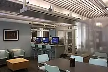 The library features three group study rooms and ten public computers, a scanner, printer, and five large LCD screens. The study rooms are outfitted with whiteboard paint and writable glass surfaces, to facilitate group collaboration on problems.[15]