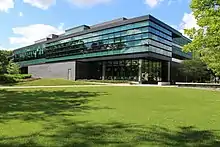 In response to the doubling of student enrolment over the past decade, the UTM campus building infrastructure has continued to expand to meet growing enrollment needs.[32][33] The construction of the Instructional Centre, also known as the Instructional Building (IB), had plans drawn out in 2002.[34] Located next to the Hazel McCallion Academic Learning Centre and Library on the north side at the end of the campus's outer circle road, the Instructional Building covers a total of 13,000 square metres (140,000 sq ft) of space spread out throughout its three stories. The much-innovated construction of the IB building is composed of green patinated copper strips aiming in a vertical direction continuing inside the building, adding to the physical appearance of the facility.[35] The use of the copper panels increases classroom space by 50% and increases the use of green infrastructure by 60%.[35][36] UTM's Instructional building includes geothermal heating and cooling systems under the nearby football field as well as awnings with thin photovoltaic cells which contribute to shade on the south side of the building.[35][36][37] Other renewable energy ideas were also included in the construction of the building such as the inclusion of green roofs and reflective membranes which play a big role in the reduction of urban heat as well as energy and water-efficient lighting and fixtures.[36][37] The building has been considered as a LEED silver-certified project and will soon be certified as LEED Gold. In addition, the building contains many windows, which enable much light to enter which creates a warm and friendly atmosphere for students.[32]