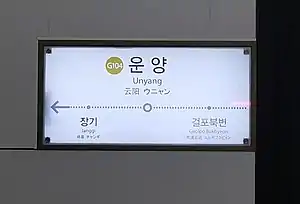Unyang Station is a station on the Gimpo Goldline in Gimpo, South Korea. It opened on September 28, 2019.[1]