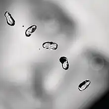 The album cover pictures five water drops in a diagonal line, over a blurred background of Gabriel's face. Each drop contains a refracted image of Gabriel's face.