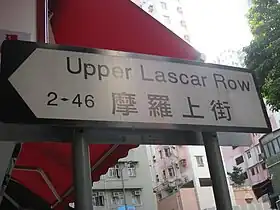 Upper Lascar Row is a narrow alley in Mid-Levels which runs parallel to Hollywood Road on the north side. The straight alley measures over 500 feet (150 m), and there was an Indian police dormitory in the street. On 11 February 1911 a fire broke out on Upper and Lower Lascar Row, destroying 16 houses and damaging another 24.[6]