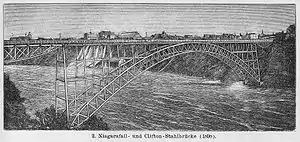 Built in 1897–98 by the Pencoyd Bridge Company, the Upper Steel Arch Bridge was located 14 ft (4.3 m) closer to the American Falls than the bridge that it replaced.[3] When completed, the bridge became the largest steel arch bridge in the world. Its features included a double track for trolley cars and room for carriages and pedestrians.[4] The bridge had to be constantly protected from ice bridges that formed over the river every winter. In January 1899 a huge ice bridge threatened the bridge when ice piled around its abutments due to their close proximity to the river's surface. The bridge was subsequently fortified with a 24-foot (7.3 m) tall stone wall around the abutments.[4]