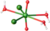 Structure of the molecular complex uranyl chloride, trihydrate (UO2Cl2(H2O)3). Color scheme: red = O, green = U, Cl.[1]