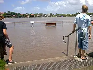 Although the Woolstore Precinct is situated close to the Brisbane River, the severe flood that occurred in 2011 did not cause any major damage to the buildings in the precinct. Even though in the nearby suburb of New Farm a considerable amount of residence and commercial area was inundated during the river surge (and by stormwater backing up drains), only parts of the riverside walkways in the Woolstore Precinct were flooded. All buildings and the major roads of Macquarie Street, Vernon Terrace and Skyring Terrace within the boundary of Woolstore Precinct were located high enough from the highest water level recorded and thus were safe from the flood. River debris were washed up at the end of Commercial Road near the Teneriffe Ferry and also on the walkway outside Eve Restaurant. The Nouvelle Apartments on Skyring Terrace reported some drain backflow problem but was not severe.[19] Some residences at the northern end of the Vernon Terrace and Skyring Terrace suffered electricity loss for a variable period during the flood.