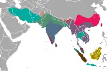The scientific name Urva was coined by Brian Houghton Hodgson as the specific name of crab-eating mongoose in 1836,[4] and as the generic name in the following year.[5] Urva species have a wide distribution spanning from the Arabian Peninsula to the Indonesian island of Java.[6] The small Indian mongoose (U. auropunctata) has been introduced to several islands in the late 19th century, where it has become an invasive species.[7][8]