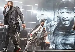 Usher appeared at the 2010 MTV Video Music Awards on September 12, 2010.[97] He then performed at the 2010 American Music Awards on November 21, 2010, and also won the awards for Male Soul/R&B artist and Favorite Soul/R&B album for his album Raymond v. Raymond.[98] According to Rap-Up.com, Usher started working on his next studio album,[99] again teaming up with long-time collaborator Rico Love.[99] The OMG Tour began in November 2010[100] and ended on June 1, 2011. On February 6, 2011, Usher also made an appearance in the Super Bowl XLV halftime show to sing his song "OMG" with The Black Eyed Peas' singer will.i.am.[101]