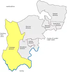 1950–1974: Under 1950 redistribution, Ruislip-Northwood became a new seat in the north and north-east. Uxbridge with immediate neighbours north south and east (together forming the Municipal Borough of Uxbridge in 1955) was re-united with Yiewsley and West Drayton, to form the last incarnation of the county division.