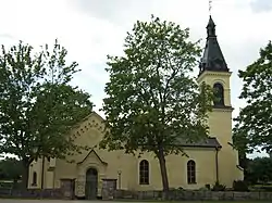 West of the church lies the parsonage, which consists of a main building (built 1849–50) and two wings (18th century) as well as a well-preserved tithe barn. The former church school is also located nearby. All together, these buildings constitute an unusually well-preserved ensemble.[3]