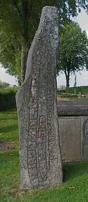 The runic text states that the stone was raised by two brothers named Kárr and Kali or Kalli in memory of their father Véurðr. The runic inscription states in Old Norse that the father was miok goðan þegn or "a very good thegn." The exact role of thegns in southern Sweden is a matter of debate, but the most common view is that these persons constituted a Nordic elite somehow connected to Danish royal power. About fifty other runestones refer to the deceased being a thegn. Of these, four other runestones use exactly the same phrase, miok goðan þegn, Vg 108 in Tängs gamla, Vg 137 Sörby, Vg 150 in Velanda, and DR 99 in Bjerregrav. The name of the father combines the Old Norse words vé and urðr for a name that means "guardian of the holy place[1] or sanctuary."[2] While this may have been a family name inherited from a goði, which is an Old Norse term for a priest or chieftain,[1] that the father was also a thegn suggests that he was a local chieftain with responsibilities for caring for and arranging feasts at a religious sanctuary.[2] Although the sons were Christian as indicated by their use of a cross in the inscription, one has the name Kárr which is Old Norse for "lock of hair" or "curly hair."[3] It has been suggested that this was a name associated with cultic initiates who grew long hair, and supports an identification of the figure on the inscription as being that of the father in ritual attire.[1] The name Kárr was often combined with that of Odin in Óðinkárr, and appears in a possible cultic initiate reference in the names on inscriptions on DR 4 in Hedeby, DR 81 in Skjern, DR 133 in Skivum, and DR 239 in Gørlev.[1][3] The name Kárr is used on Vg 56 in Källby, which depicts a figure possibly in cultic attire.[1] Kárr is also used without necessarily any cultic reference in inscriptions Sm 90 in Torshag, Sö 128 in Lids, U 643 and U 644 in Ekilla bro, U 654 in Varpsund, and U 792 in Ulunda, with U 644 and U 654 referring to the same person.[4]