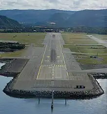 At both ends of the runway, the taxiway ends 150 metres (490 ft) from the start of the runway, forcing aircraft which need the full length to backtrack. An extension of the taxiways would help with this problem.[73] Both at Terminal A and B, there will be a need for double taxiways. This will result in insufficient space for general aviation at its current location, and this has been proposed moved eastwards past the military installations. Several airlines, in particular Helitrans, has indicated need for more space. Proposals have been made to establish a heliport to allow flight to oil platforms on the Norwegian continental shelf.[74] The military has suggested to fill in a large section of the river delta at the west end of the runway, and move some of the cargo and helicopter operations there, but environmental concerns have been raised by among others Avinor. The cost of establishing access to the artificial land is also high.[75] By 2050, there may be need for a second, parallel runway to meet demand, and initial plans call for a 1,199 metres (3,934 ft) runway which would be used by general aviation, regional airlines and helicopters.[73]