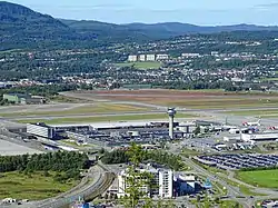 Trondheim Airport is a joint military and civilian airport located in the municipality of Stjørdal in Trøndelag, with the northern part of the airport bordering the town of Stjørdalshalsen.[6] To the west, the airport borders the Trondheimsfjord, and to the south the Stjørdal River.[7] Combining the functions as an international, domestic and regional airport, it is located 10 nautical miles (19 km; 12 mi) east of Trondheim.[1] Most of the airport area is owned by the Norwegian Ministry of Defence, although the civilian facilities and the air traffic control are owned and operated by Avinor, a subsidiary of the Norwegian Ministry of Transport and Communications.[8]